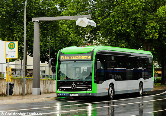 In Vorbereitung des Einsatzes von Elektrobussen weilte in der letzten Juli-Woche ein EvoBus MB eCitaro der üstra aus Hannover in Mönchengladbach, um die Ladeinfrastruktur auf dem Betriebshof und an der Haltestelle Künkelstraße zu testen. Christopher Lambers hielt den Hannoveraner Wagen 9512 am 28.07.2021 unter der Ladehaube an der Künkelstraße im Bild fest. Die NEW hat vier Elektrobusse des gleichen Typs für den Einsatz auf der Linie 033 bestellt.