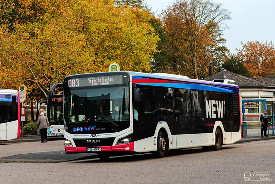 (n.de) Die NEW mobil und aktiv Viersen GmbH hat im September ihre diesjährigen Neufahrzeuge in Betrieb genommen. Dabei handelt es sich um drei MAN 12C (NL 280 Hybrid Lion's City), die die Wagennummern 90, 92 und 93 sowie die entsprechenden Kennzeichen VIE-NW + Wagennummer erhielten. Die technische Ausstattung entspricht mit Mildhybrid-Modul, Abbiegeassistent und Klimaanlage den in den vergangenen Jahren beschafften Fahrzeugen von Mercedes-Benz, erstmals in Viersen kam zudem eine neue Innenraumgestaltung mit Holzbodenimitat und neuem Sitzpolsterstoff zur Anwendung. Die Aufnahmen von Christopher Lambers zeigen den Wagen 92 am 23.09.2022, dem ersten Einsatztag, am Busbahnhof in Dülken und den Wagen 93 am 29.10.2022 am Busbahnhof in Süchteln.