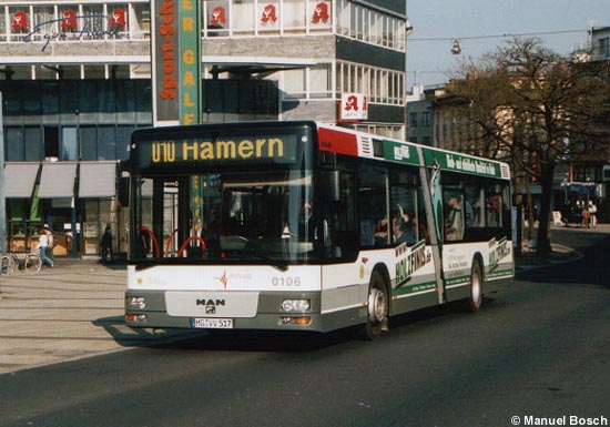 (n.de) Der Wagen 8902, ein MAN SL 202 aus dem Jahre 1989, verkehrt nach Entfernung der Werbung für "Hörgeräte Meyer" jetzt werbefrei.