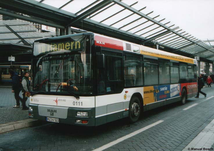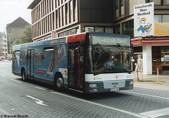 Ebenfalls als Nachtrag zur Meldung vom 21.06.2002 eine Aufnahme des Wagen 0112, der als erster Omnibus der NVV AG eine vollständig die Fenster einbeziehende Werbung für die "NVV AG Bäder" erhielt. Am 21.06.2002 wurde der Wagen am Mönchengladbacher Hauptbahnhof im Einsatz auf der Linie SB1 abgelichtet.