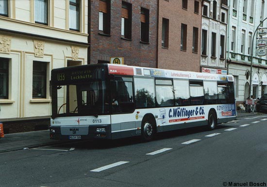 (n.de) Ergänzend zur Meldung vom 31.05.2002 an dieser Stelle eine Aufnahme des MAN A21 (NL 223) mit der Wagennummer 0113, der neuerdings eine Reklame für "C. Wölfinger & Co." trägt. Das Bild entstand am 31.05.2002 an der Haltestelle Künkelstraße.