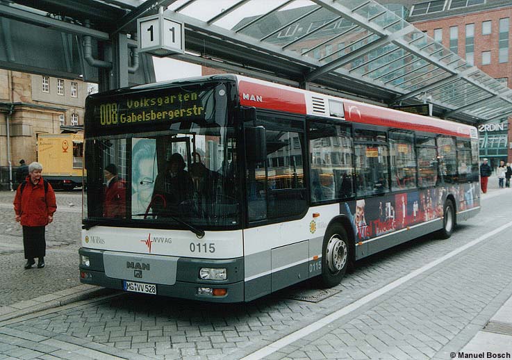 Die Wagen 0113 bis 0115 erhielten eine Werbung für das "Theater Krefeld - Mönchengladbach", wobei bei erstgenanntem die Reklame inzwischen wieder entfernt wurde. Die Aufnahme zeigt den Wagen 0115 am 29.12.2001 ebenfalls am Mönchengladbacher Hauptbahnhof. |