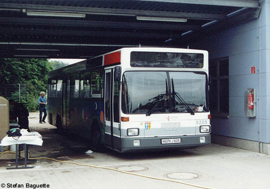 Ergänzend zu den am 12.06.2002 gezeigten Aufnahmen von der Bemalung des Wagen 9208 sei hier ein Foto des Fahrzeugs aus dem Liniendienst gezeigt. Das Bild des MAN SL 202 entstand am 21.06.2002 am Hauptbahnhof in Mönchengladbach.