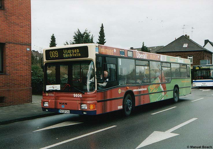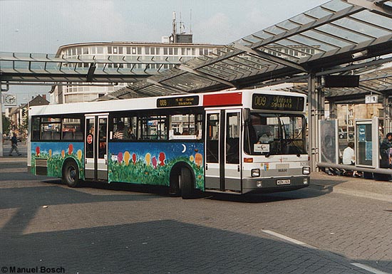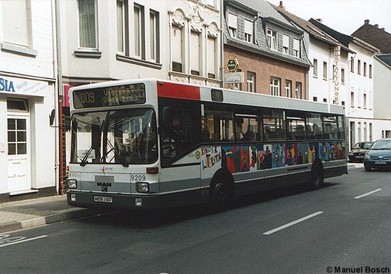 Wie am 21.06.2002 gemeldet, wurde der Wagen 9209, ebenfalls ein MAN SL 202, von Schülern der Rheydter Realschule bemalt. Die Aufnahme zeigt das Fahrzeug am 21.06.2002 in Viersen an der Haltestelle Gereonsplatz.