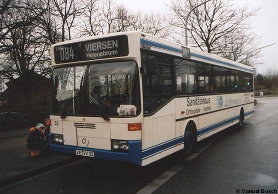 Bei dem Wagen 52, einem Mercedes-Benz O 405 aus dem Jahre 1988, wurde die Werbung für das "Sanitätshaus Lettermann" entfernt. Das Foto entstand im April 2002 während der morgendlichen Fahrt der Linie 084 nach Helenabrunn an der Haltestelle Immelnbusch. Bis zuletzt beinhaltete die Werbung die alte Ortsangabe "4060 Viersen 1".