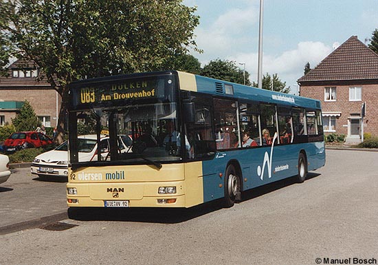 (n.de) Wie bereits am 31.05.2002 vermeldet, wurden bei dem MAN A21 (NL 223) mit der Wagennummer 92 inzwischen "niederrheinwerke"-Schriftzüge auf der neuen Lackierung angebracht. Erstmals seit 1998 erhielt damit ein neugelieferter Omnibus wieder eine Unternehmenslackierung, in den letzten Jahren waren Neufahrzeuge ausschließlich mit Vollwerbungen versehen worden.