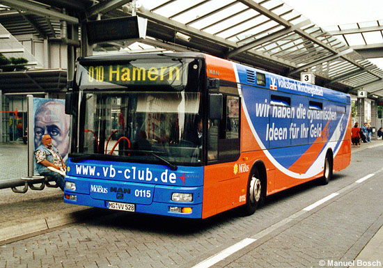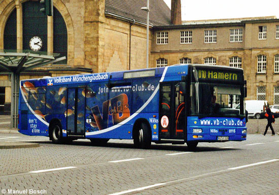(n.de) Als zweiter Omnibus der Niederrheinischen Versorgung und Verkehr AG (NVV) in Mönchengladbach wurde der MAN A21 (NL 223) mit der Nummer 0115 wie bereits gemeldet Anfang Juni mit einer auch die Fensterflächen vollständig einbeziehenden Werbung versehen, bei diesem Wagen allerdings erstmals unter Einbezug auch der Front sowie der gesamten Seitenflächen. Die beiden Aufnahmen zeigen das für die Volksbank werbende Fahrzeug am 03.06.2004 in Mönchengladbach am Hauptbahnhof.