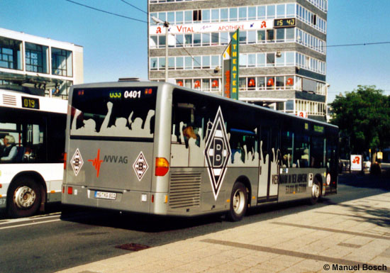 Wie am 24.09.2005 gemeldet, erhielten vier EvoBus MB O 530 (Citaro) aus dem Jahre 2004 eine Vollwerbung für den Fußballverein "Borussia Mönchengladbach", nachdem sie zuvor einige Wochen im Grundlack eingesetzt wurden. Das linke Bild zeigt den Wagen 0405 am 20.08.2005 am Hauptbahnhof in diesem Zustand, auf dem rechten Bild ist der vervollständigte Wagen 0401 am 19.09.2005 an der Musical-Bühne zu sehen.