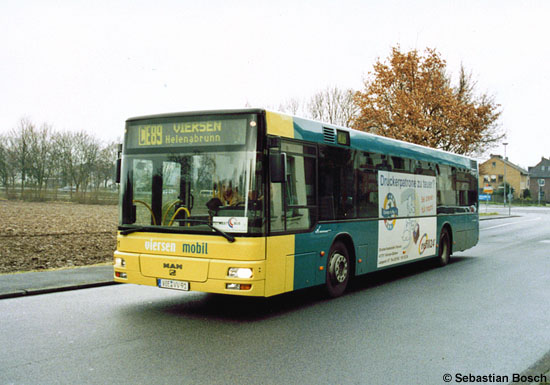 (n.de) Bei der Niederrheinwerke Viersen mobil GmbH (niederrheinwerke) wurde das bei dem MAN A21 (NL 223) mit der Wagennummer 78 auf der Fahrerseite angebrachte 18/1-TrafficBoard für "Viersen blüht" entfernt. Das Bild vom 13.05.2008 zeigt den Wagen mit dieser Reklame im Einsatz als Linie 083 nahe der Haltestelle Gymnasium an der Löh.