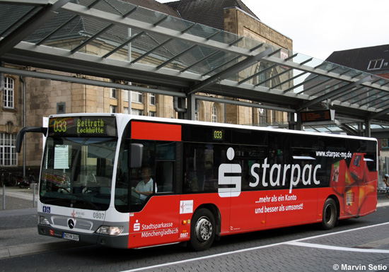(n.de) Bei der Niederrheinische Versorgung und Verkehr AG (NVV) aus Mönchengladbach wurde neben dem bereits gemeldeten EvoBus MB O 530 (Citaro) mit der Nummer 0808 auch der typgleiche Wagen 0807 mit einer Vollwerbung unterhalb der Fenster für "Stadtsparkasse Mönchengladbach - starpac" verse-hen. Das Bild von Marvin Setio zeigt das Fahrzeug am 06.07.2010 am Mönchengladbacher Hauptbahnhof.