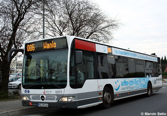 (n.de) Bei der Niederrheinische Versorgung und Verkehr AG (NVV) aus Mönchengladbach wurde der EvoBus MB O 530 (Citaro) mit der Wagennummer 0911 mit einer Bandenwerbung für "ortho-care West" versehen. Das Fahrzeug tritt damit die Nachfolge des ausgemusterten EvoBus MB O 405 N2 mit der Num- mer 9708 an. Im Bild von Marvin Setio ist der Wagen 0911 am 18.11.2010 an der Rheinstraße zu sehen.