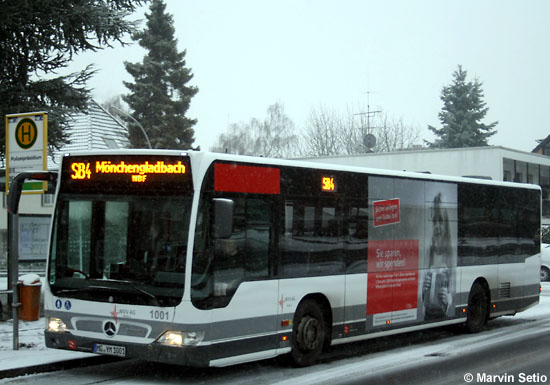Die als Wagen 1001 bis 1007 geführten EvoBus MB O 530 (Citaro) erhielten auf der Fahrerseite ein 18/1-TrafficBoard für die "Stadtsparkasse Mönchengladbach". Damit wurden erstmals Fahrzeuge der diesjähri- gen Beschaffung mit Reklame versehen. Die Aufnahme von Marvin Setio zeigt den solchermaßen beklebten Wagen 1001 am 29.11.2010 an der Haltestelle Polizeipräsidium.