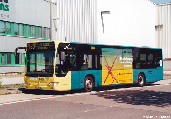 Das wie berichtet im Mai auf dem EvoBus MB O 530 (Citaro) mit der Nummer 56 angebrachte 18/1-TrafficBoard für "20 Jahre Skulpturensammlung" wurde von einer Viersener Künstlerin entworfen. Die nieder- rheinwerke haben den Werbeträger für drei Monate kostenfrei zur Verfügung gestellt, über Spenden soll eine längere Laufzeit ermöglicht werden. In der Aufnahme ist das Fahrzeug am 23.05.2010 an der Halte- stelle Helmholtzstraße Ende zu sehen.