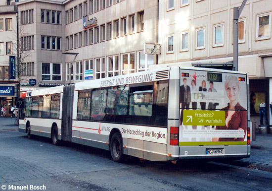 (n.de) Bei der NVV mobil und aktiv GmbH aus Mönchengladbach erhielt neben dem Wagen 0264 auch der MAN A23 (NG 263) mit der Wagennummer 0265 auf dem Heck ein 4/1-TrafficBoard für "MSI Gebäudereinigung". Die linke Aufnahme zeigt den solchermaßen beklebten Wagen 0264 am 08.01.2011 am Mönchen- gladbacher Hauptbahnhof.