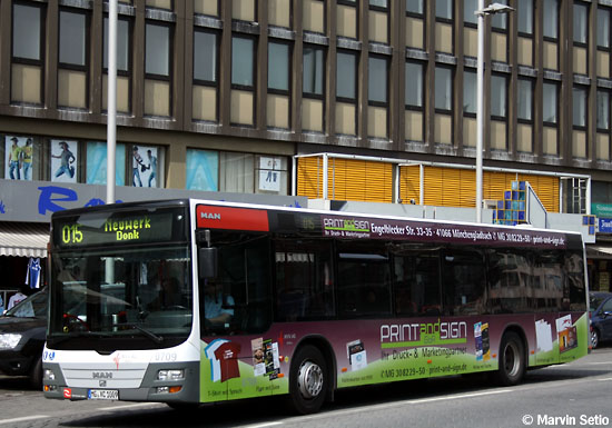 (n.de) Bei der NVV mobil und aktiv GmbH aus Mönchengladbach wurde der MAN A21 (NL 273 Lion's City) mit der Wagennummer 0709 mit einer seitlichen Vollreklame versehen, wobei auf der Türseite für "MPU-Verkehr & Psychologie", auf der Fahrerseite und dem Heck hingegen für "print and sign" geworben wird. Die Aufnahme von Marvin Setio zeigt das Fahrzeug von der Fahrerseite am 05.05.2011 am Mönchenglad- bacher Hauptbahnhof.