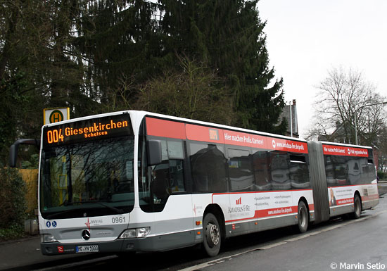 (n.de) Mit dem Wagen 0961 wurde der einzige im Jahr 2009 gelieferte EvoBus MB O 530 G (Citaro) der NVV mobil und aktiv GmbH aus Mönchengladbach mit einer Bandenwerbung für "Amadeus FiRe" versehen. In der linken Aufnahme von Marvin Setio ist der Gelenkbus am 11.02.2011 an der Hilderather Straße zu sehen.