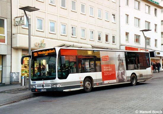 Bei den als Wagen 1001 bis 1007 eingereihten EvoBus MB O 530 (Citaro) wurde dagegen das 18/1-Traffic- Board auf der Fahrerseite für die "Stadtsparkasse Mönchengladbach" entfernt. Die Aufnahme zeigt den Wagen 1003 mit dieser Reklame am 08.01.2011 an der Haltestelle Stepgesstraße.