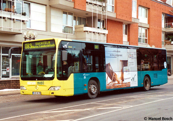 (n.de) Bei der NVV mobil und aktiv GmbH aus Mönchengladbach wurde bei den EvoBus MB O 530 (Citaro) mit den Wagennummern 1001 bis 1003 das 4/1-TrafficBoard für "O2" auf dem Heck entfernt. Die Aufnahme zeigt den Wagen 1001 mit dieser Reklame am 03.06.2011 an der Haltestelle Wickrath Markt.