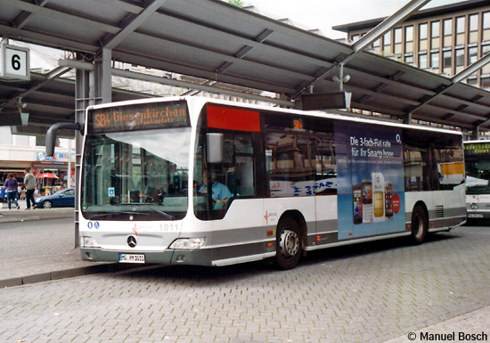 (n.de) Bei der NVV mobil und aktiv GmbH aus Mönchengladbach wurde bei den drei EvoBus MB O 530 (Citaro) mit den Nummern 0913, 0914 und 1004 das 18/1-TrafficBoard für "Deutsche Bahn - Weltmeister-BahnCard 25" auf der Fahrerseite entfernt. Im Bild ist der Wagen 1004 am 03.06.2011 an der Haltestelle Stepgesstraße zu sehen.