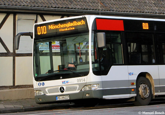 Nachdem bereits im Oktober und November die bisherigen "NVV"-Anschriften an den Omnibussen entfernt worden waren, wurden rund um Weihnachten zahlreiche Fahrzeuge mit dem neuen "NEW"-Logo versehen. Bei den Wagen der Baujahre bis 2004 wurde auf der Front und am Heck das "NEW"-Logo angebracht, die jüngeren Wagen erhielten die Aufschrift "NEW MöBus" im neuen Stil zusätzlich auch seitlich. Mit der neuen Beschriftung ist in der Auf- nahme der als Wagen 0914 eingereihte EvoBus MB O 530 (Citaro) am 02.01.2012 an der Endstelle Hamern zu sehen.