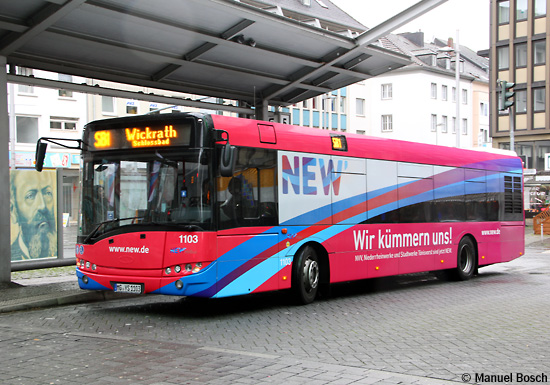 (n.de) Als nunmehr siebtes Fahrzeug der NEW mobil und aktiv Mönchengladbach GmbH erhielt der Solaris Urbino 12 mit der Wagen- nummer 1105 eine Vollwerbung für "NEW". Die baugleichen Wagen 1108 bis 1110 wurden unterdessen mit einem 18/1-TrafficBoard auf der Fahrerseite für "Kamps" versehen.