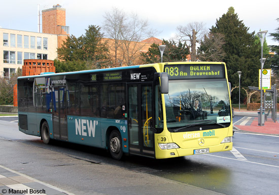 Bereits bis zum Jahresende wurden die Omnibusse der nunmehrigen NEW mobil und aktiv Viersen GmbH mit der neuen Unternehmensbezeichnung versehen. Mehrere Fahrzeuge erhielten auf der Türseite und dem Heck das neue "NEW"-Logo in großer Darstellung, wie es zuvor auch bei dem "niederrheinwerke"-Signet der Fall gewesen war. Im Bild ist der neu beschriftete EvoBus MB O 530 (Citaro) mit der Wagennummer 39 am 30.12.2011 am Busbahn- hof in Viersen zu sehen.
