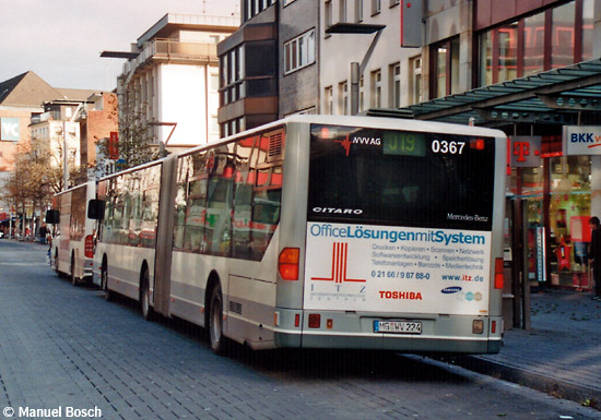 Bei dem EvoBus MB O 530 (Citaro) mit der Wagennummer 0304 wurde die Vollwerbung für die "Frauen-Weltmeisterschaft 2011" ent- fernt, nachdem die auch in Mönchengladbach abgehaltene Veranstaltung inzwischen ein halbes Jahr zurückliegt. Stattdessen erhielt der Wagen eine die Front einbeziehende Vollwerbung für das "NATO-Musikfest", die im Foto oben rechts ebenfalls am Mönchengladbacher Hauptbahnhof zu sehen ist.