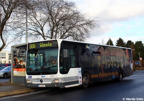 Der als Wagen 0806 eingereihte EvoBus MB O 530 (Citaro) erhielt eine auch die Fenster einbeziehende Vollwerbung für das "Theater Krefeld Mönchengladbach". Auf dem Foto unten rechts von Marvin Setio ist das Fahrzeug am 19.12.2013 an der Rheinstraße zu sehen.