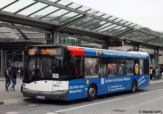 (n.de) Bei der NEW mobil und aktiv Mönchengladbach GmbH sind weitere neue Werbungen zu verzeichnen. Der Solaris Urbino 12 mit der Wagennummer 1106 erhielt auf Fahrer- und Türseite eine auch die Fenster einbeziehende Vollwerbung für das "Prinzenpaar der Stadt Mönchengladbach", das Heck wurde hingegen nicht beklebt. Die von der NEW unterstützte Beschriftung soll über die Karnevals- zeit hinaus für ein Jahr erhalten bleiben. Das linke Bild von Marvin Setio zeigt den Bus am 18.02.2014 am Mönchengladbacher Hauptbahnhof.