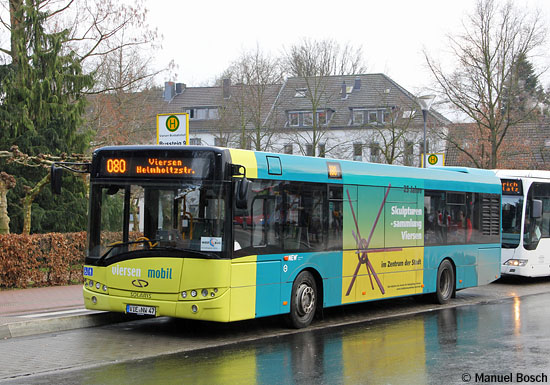 Auch der zweite, als Wagen 47 eingereihte Solaris Urbino 12 des Baujahres 2011 erhielt fahrerseitig ein 18/1-TrafficBoard, das für "25 Jahre Skulpturensammlung" wirbt. Im rechten Bild steht der Bus ebenfalls am 24.01.2014 am Viersener Busbahnhof.