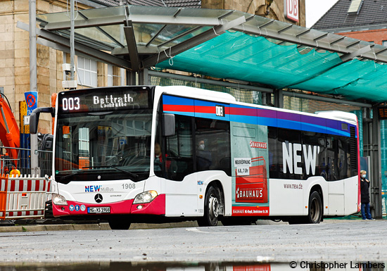 (n.de) Bei der NEW mobil und aktiv Mönchengladbach GmbH erhielten die drei EvoBus MB O 530 C2 Hybrid (Citaro) mit den Wagennummern 1905, 1906 und 1908 ein fahrerseitiges 18/1-TrafficBoard für "Bauhaus" - das Bild von Christopher Lambers zeigt Wagen 1908 am 15.07.2021 am Mönchengladbacher Hauptbahnhof. Die drei als Wagen 2064 bis 2066 eingereihten EvoBus MB O 530 G C2 Hybrid (Citaro) wurden mit einem fahrerseitigen 18/1-TrafficBoard für "Lucky Bike" versehen, womit bei den Wagen 2065 und 2066 das bisherige 18/1-TrafficBoard für "Ehrensache" ersetzt wurde.