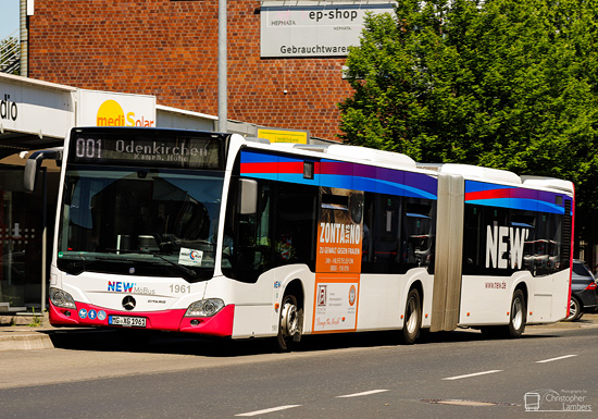 (n.de) Bei der NEW mobil und aktiv Mönchengladbach GmbH erhielten die EvoBus MB O 530 C2 Hybrid (Citaro) mit den Wagennummern 1901 und 1902 auf der Fahrerseite ein 18/1-TrafficBoard und auf der Türseite ein 4/1-TrafficBoard für das "VRR YoungTicketPLUS". Bei den drei als Wagen 1905, 1906 und 1908 geführten EvoBus MB O 530 C2 Hybrid (Citaro) wurde das fahrerseitige 18/1-TrafficBoard für "Bauhaus" durch ein neues Motiv für den identischen Werbekunden ersetzt.