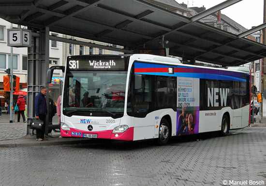(n.de) Die neue Eigenwerbekampagne der NEW wurde zwischenzeitlich auf etlichen Bussen der NEW mobil und aktiv Mönchengladbach GmbH angebracht, wobei es zwei unterschiedliche Motive gibt, die sich im Bild sowie im Werbespruch unterscheiden. Neben den bereits gemeldeten Fahrzeugen wurden auch die EvoBus MB O 530 C2 (Citaro) mit den Wagennummern 1503, 1508 bis 1512, die EvoBus MB O 530 G C2 (Citaro) mit den Nummern 1564 und 1565, die als Wagen 1910, 1913 und 2003 bis 2006 eingereihten EvoBus MB O 530 C2 Hybrid (Citaro) und die EvoBus MB O 530 G C2 Hybrid (Citaro) mit den Nummern 1963 und 1968 mit einem fahrerseitigen 18/1-TrafficBoard für "NEW Mach das Leben an" versehen. Die Aufnahme vom 05.10.2021 zeigt den Wagen 2005 mit dem zweiten Motiv am Mönchengladbacher Hauptbahnhof.