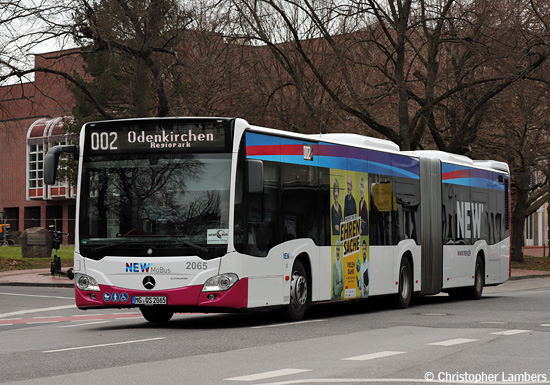 (n.de) Bei der NEW mobil und aktiv Mönchengladbach GmbH wurde bei den EvoBus MB O 530 G C2 Hybrid (Citaro) mit den Wagennummern 2065 und 2066 das fahrerseitige 18/1-TrafficBoard für "NEW Advent" durch ein 4/1-TrafficBoard an gleicher Stelle für die Aktion "Ehrensache" ersetzt, bei der sieben Institutionen von Land Nordrhein-Westfalen, Stadt Mönchengladbach und Kreis Viersen einen Dank an ehrenamtlich tätige Bürger/innen ausdrücken. Die Aufnahme von Christopher Lambers zeigt den Wagen 2065 mit der neuen Beklebung am 20.01.2021.