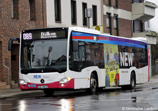 (n.de) Bei der NEW mobil und aktiv Viersen GmbH wurden die beiden im Jahr 2019 beschafften EvoBus MB O 530 C2 (Citaro) erstmals mit Werbungen versehen: Die Wagen 19 und 21 erhielten ein fahrerseitiges 4/1-TrafficBoard für "Ehrensache". Die Aufnahme von Christopher Lambers zeigt den Wagen 19 am 17.01.2021 an der Gartenstraße in Viersen.