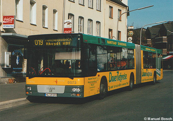 Bereits im Dezember 2002 wurde der Wagen 0073 der NVV in Mönchengladbach, ein MAN A23 (NG 263), mit dieser Vollwerbung versehen. Am 27.02.2003 konnte der Niederflur- gelenkbus in Viersen am Remigiusplatz im Einsatz auf der Linie 019 aufgenommen werden.