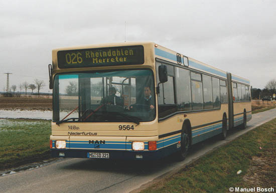 Umlaufbedingt kommt der Einsatz von Gelenkbussen der NVV auf der Merreter-Runde der Linie 026 von Mönchengladbach-Rheindahlen aus zustande. Am 28.01.2003 ist der MAN A11 (NG 312) mit der Nummer 9564 in den Feldern nahe Merreter unterwegs.
