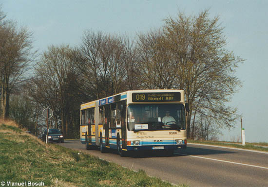 Frühlingsbeginn am Niederrhein: Am 28.03.2003 ist der Wagen 9566 der Niederrheinischen Versorgung und Verkehr AG, ein MAN A11 (NG 312), auf der Gladbacher Straße in Viersen zwischen dem Omperter Weg und dem Ummertal in Richtung Mönchengladbach unterwegs.