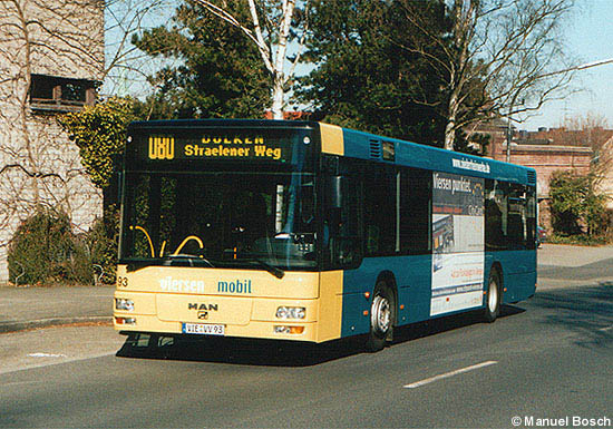 Der Wagen 93 der Niederrheinwerke Viersen mobil GmbH, der einzige MAN A21 (NL 263), verlässt am 23.03.2003 die Haltestelle Am Blauen Stein in Viersen zur Fahrt als Linie 080