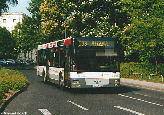 Im Zuge der Umleitungsstrecke in der Mönchengladbacher Innenstadt befährt der Wagen 9905 der NVV, ein MAN A21 (NL 223), am 08.05.2003 die Abteistraße in Höhe des Hans-Jonas-Parks talwärts. Weitere Informationen und Aufnahmen dazu in den Nachrichten.