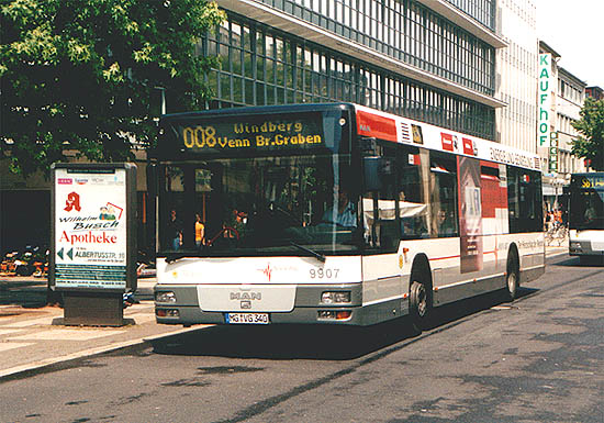 Vor der Kulisse des "Kaufhof"-Hauses in der Mönchengladbacher Fußgängerzone Hindenburgstraße bringt der MAN A21 (NL 223) mit der Wagennummer 9907 der NVV am 14.06.2003 die samstäglichen Einkäufer zurück in Richtung des Stadtteils Venn.