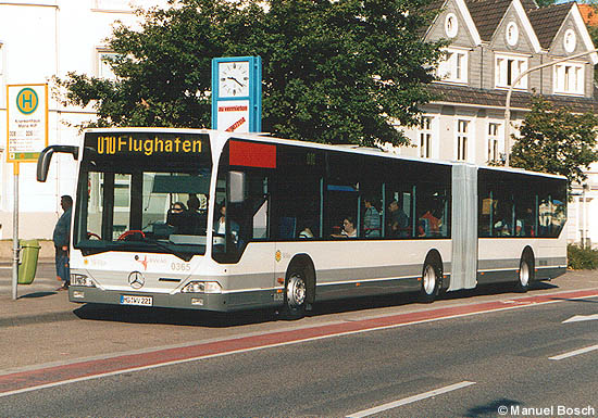 Vier EvoBus MB O 530 und sieben O 530 G hat die NVV in Mönchengladbach in Dienst gestellt. Der neue Wagen 0365 steht am 20.08.2003, dem ersten Einsatztag der Gelenk-wagen, an der Haltestelle Krankenhaus Maria Hilf zur Fahrt in Richtung Flughafen bereit.