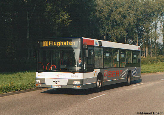 Mit der Verlegung aller Air Berlin-Flüge nach Düsseldorf ab November wird der Flughafen Mön- chengladbach an Bedeutung verlieren. Davon unbeeindruckt ist der Wagen 0109 der NVV, ein MAN A21 (NL 223), am 16.09.2003 auf der Flughafenstraße in Richtung Terminal unterwegs.