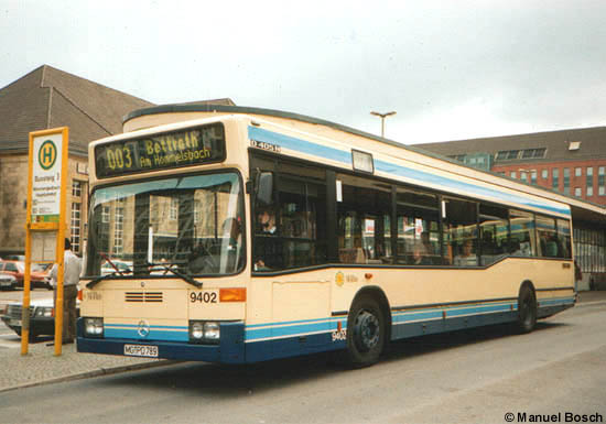 Im November 1994 wurden in Mönchengladbach mit acht Mercedes-Benz O 405 N2 die ersten Niederflurbusse der zweiten Generation dieses Herstellers in Dienst gestellt. Die Aufnahme des Wagen 9402 gelang im Sommer 1995 an der alten Haltestellenanlage des Hauptbahnhofes.