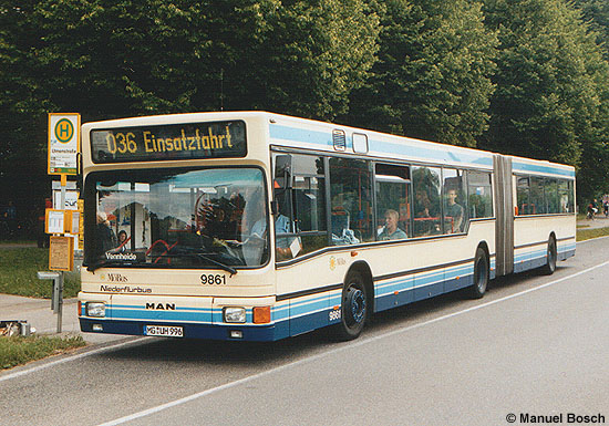 Der Wagen 9861 der NVV in Mönchengladbach, ein MAN A11 (NG 262), stand am 07.07.2003 in Willich-Schiefbahn an der Ulmenstraße zur Einsatzfahrt der Linie 036 nach Vennheide bereit, auf das Ziel wird üblicherweise nur mit einem Steckschild in der Frontscheibe hingewiesen.