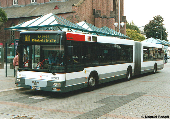 Haupteinsatzgebiet der sieben MAN A23 (NG 263) aus dem Jahre 2002 sind die stark belasteten Linien 001 und 002. Am 02.07.2003 steht der Wagen 0263 am Marienplatz in Mönchengladbach-Rheydt zur Fahrt in Richtung Alt-Mönchengladbach und Eicken bereit.