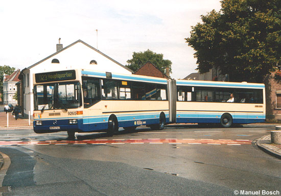 Überwiegend auf den Linien 013 und 023 gelangen die sechs Mercedes-Benz O 405 G aus dem Jahre 1992 der NVV in Mönchengladbach zum Einsatz. Am 02.07.2003 biegt der Wagen 9265 als Linie 023 nach Verlassen der Haltestelle Hardt Markt in Richtung Hauptquartier ab.