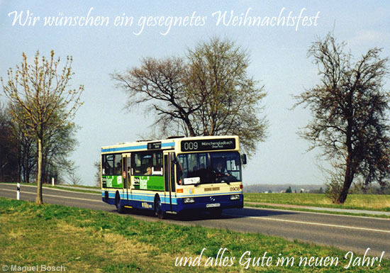 In seinen letzten niederrheinischen Frühling fuhr der Wagen 8908 der NVV in Mönchenglad-bach, ein Mercedes-Benz O 405 des Baujahres 1989, am 28.03.2003 auf der Gladbacher Straße in Viersen - vier Monate später wurde der Omnibus ausgemustert.