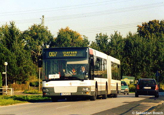 Seit September 2003 wird ein Kurs der Linie 007 ganztägig mit einem Gelenkbus bedient. Im letzten Sonnenlicht des 17.10.2003 hielt Sebastian Bosch den MAN A23 (NG 263) mit der Nummer 0065 der NVV in Viersen nahe der Haltestelle Helenabrunn Bahnhof im Bild fest.