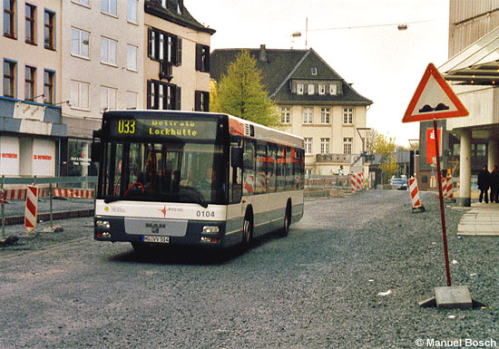 In Mönchengladbach wird der obere Abschnitt der Hindenburgstraße derzeit neugestaltet. Der MAN A21 (NL 223) mit der Nummer 0104 der NVV ist am 13.04.2004 über eine behelfs-